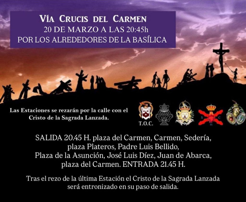 Por tanto, la Comunidad de Padres Carmelitas nos invita a este acto piadoso. La imagen del Cristo de la Sagrada Lanzada será la que presida el Vía Crucis, el cual de manera pública, al finalizar el piadoso ejercicio, será entronizado en su paso de salida.